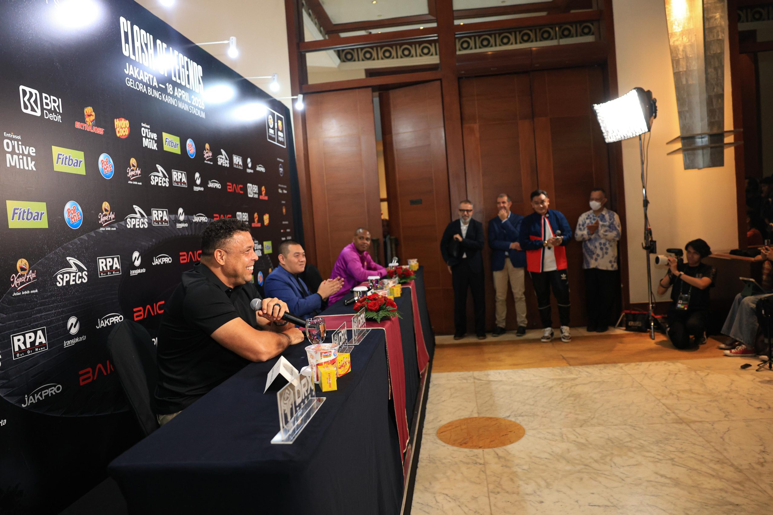 Dalam konferensi pers jelang pertandingan di Hotel The Dharmawangsa, Jakarta Selatan, Jumat (17/4), hadir legenda Brasil Ronaldo Nazário dan mantan penyerang Barcelona Patrick Kluivert. Turut hadir pula CEO Senyawa Entertainment, Reza Subekti, selaku promotor acara.