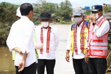 Sintang – Presiden Joko Widodo (Jokowi) didampingi Menteri Pekerjaan Umum dan Perumahan Rakyat (PUPR) Basuki Hadimuljono, Menteri Perhubungan Budi Karya Sumadi, Menteri Sosial Tri Rismaharini, Kepala Badan Nasional Penanggulangan Bencana (BNPB) Suharyanto, Ketua Komisi V DPR RI Lasarus, Gubernur Kalimantan Barat Sutarmidji meninjau progres penanganan bencana banjir di Sintang, Provinsi Kalimantan Barat, Rabu (8/12/2021).