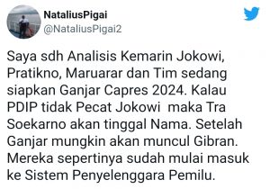 “Saya sudah analisis kemarin Jokowi, Pratikno, Maruarar dan tim sedang siapkan Ganjar Capres 2024,” kata Natalius Pigai dalam postingan di Twitter pribadinya, Kamis (5/8/2021).