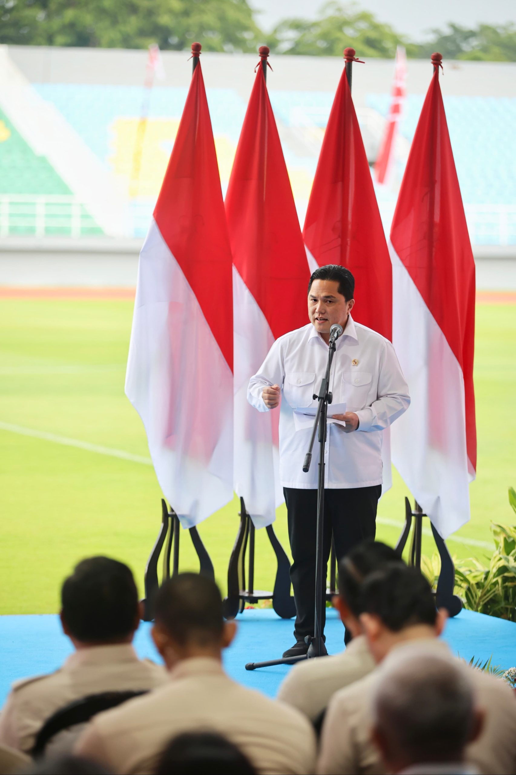 “Peresmian ini bukan hanya sekedar peresmian fasilitas olahraga tetapi juga untuk membangun karakter bangsa melalui sepak bola,” ujar Erick di hadapan Presiden Prabowo Subianto dalam Peresmian Renovasi dan Pembangunan 17 Stadion di Indonesia yang berpusat di Stadion Gelora Delta Sidoarjo, Kabupaten Sidoarjo, Jawa Timur, Senin.
