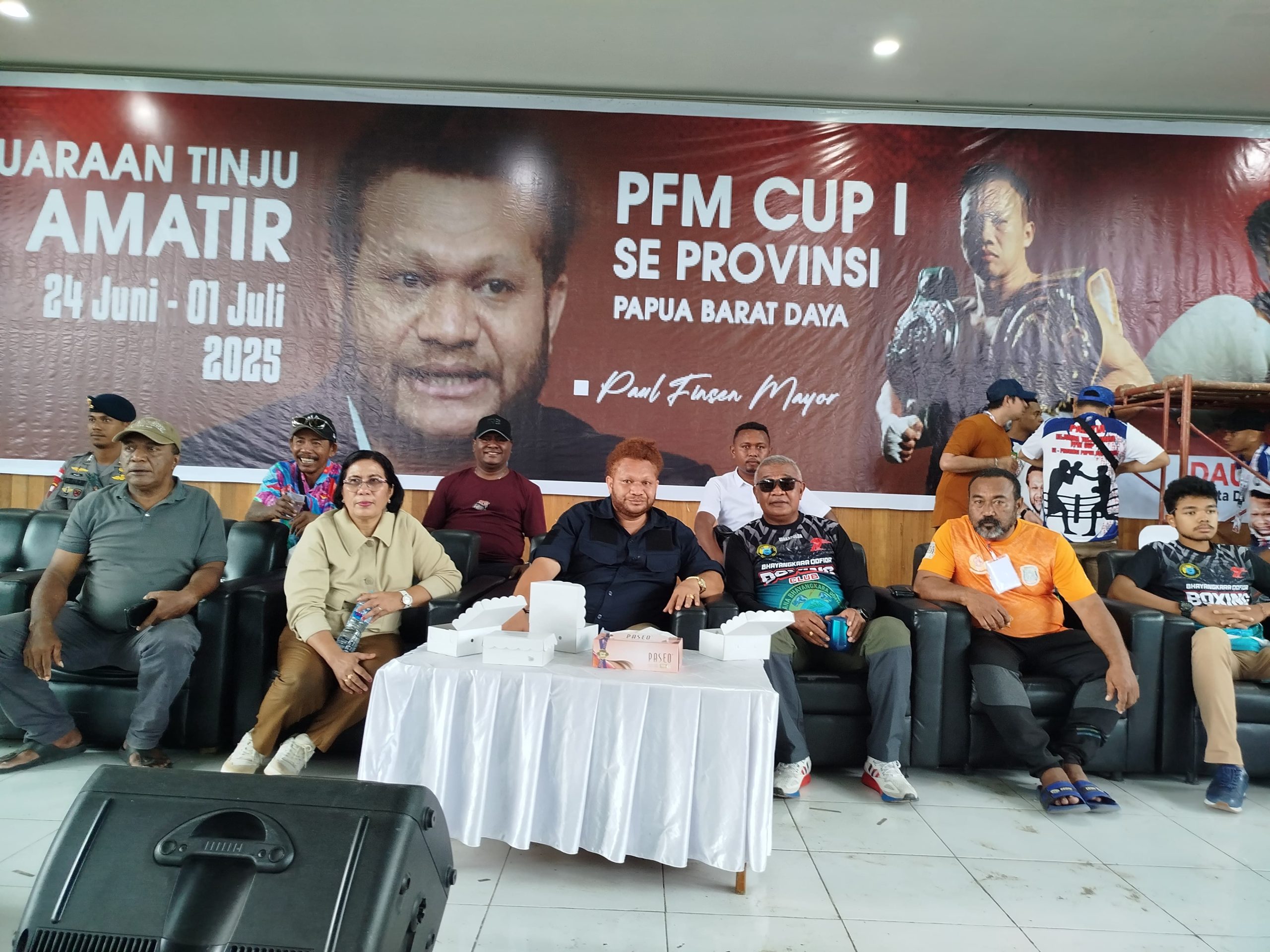 KOTA SORONG – Hari kedua pelaksanaan Kejurda Tinju Amatir PFM Cup I, Senator Paul Finsen Mayor hadir ke lokasi pertandingan. Tak lama berselang, hadir juga ke lokasi, Wakapolda Papua Barat Daya Kombes Pol. Semmy Ronny Tabhaa. Keduanya mengunjungi pertandingan untuk menyemangati para atlet yang berlaga pada hari itu.